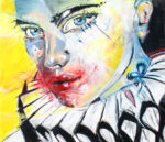 Eine expressive Porträtkomposition voller Energie und Emotion: Strahlende Gelbtöne treffen auf kraftvolle Linien und sinnliche Rottöne. Das Gesicht, halb realistisch, halb abstrakt, zieht den Betrachter mit intensiven Augen und lebendiger Mimik in seinen Bann. Der kunstvoll angedeutete Kragen verleiht dem Werk eine theatralische, beinahe ikonische Aura.