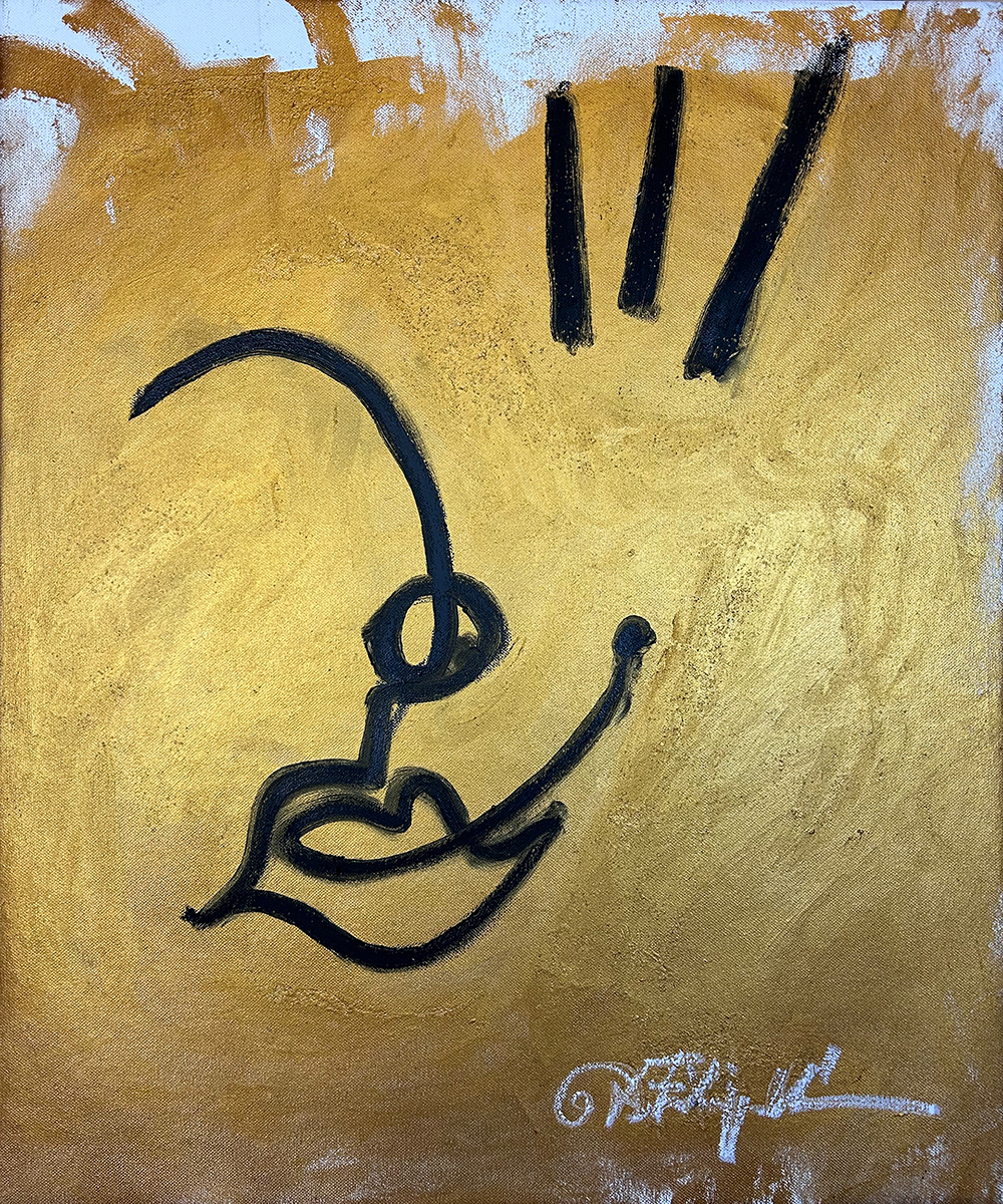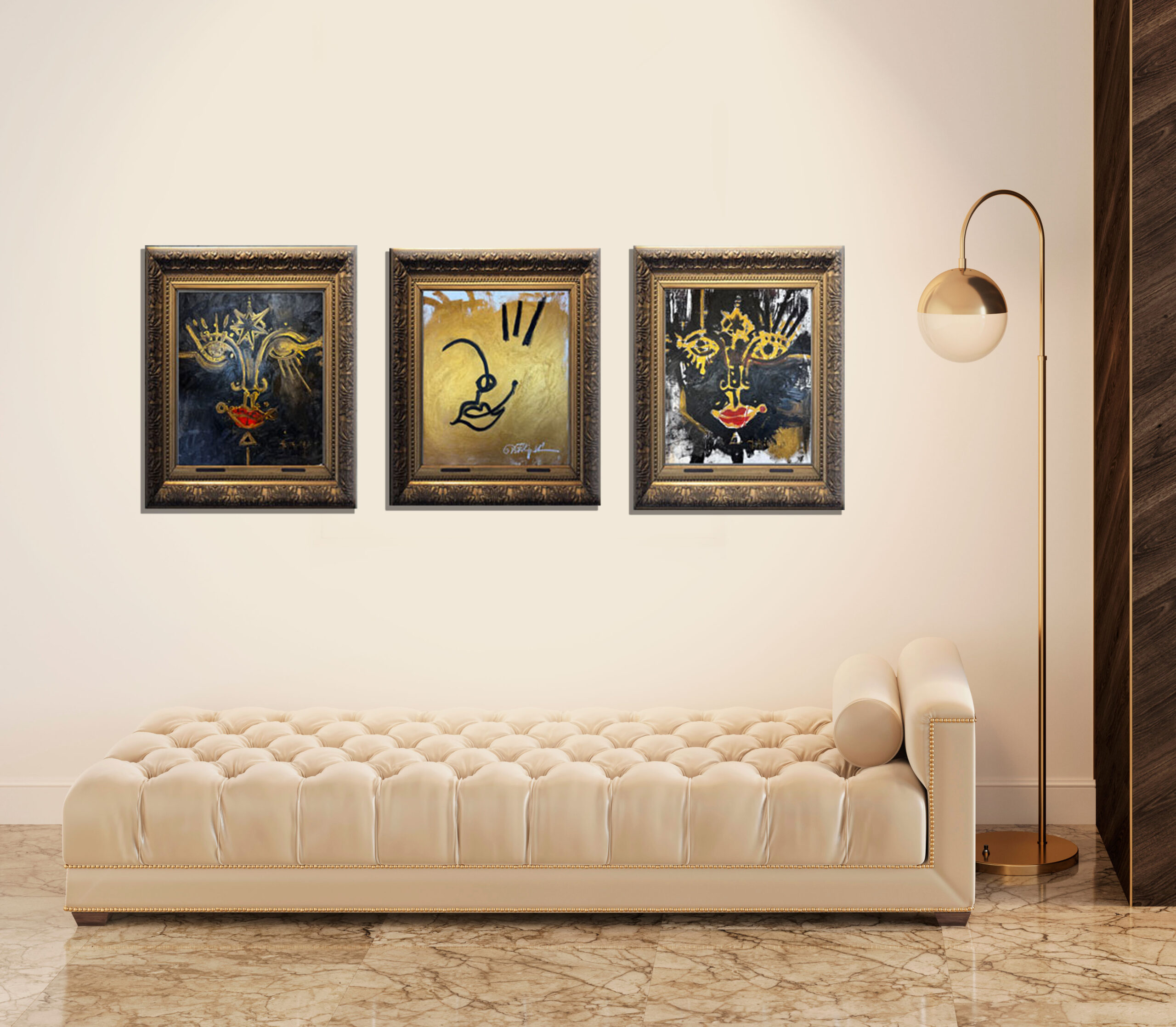Drei Werke, ein unverwechselbarer Ausdruck: pure Energie, goldene Symbolik und freche Eleganz. Jede Leinwand erzählt ihre eigene Geschichte – intuitiv, kraftvoll und sinnlich. Eine Trilogie, die nicht erklärt werden will, sondern wirkt.