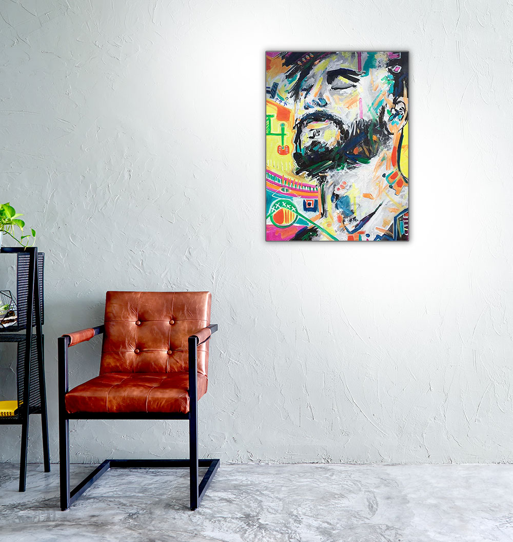 „The Silence“ zeigt einen Mann mit geschlossenen Augen, eingefasst von vibrierenden Farben und intuitiven Zeichen – ein Moment tiefer Innerlichkeit, in dem Stille zur stärksten Stimme wird. Die vielschichtigen Farbschichten und freien Gesten erzeugen eine energetische Atmosphäre, in der Ruhe nicht als Leere erscheint, sondern als Quelle von Klarheit und Kraft.